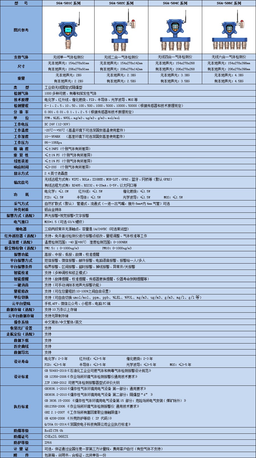 SGA-501W/506W系列無線丙二醇1-單丁基醚氣體檢測儀除基本的氣體檢測、繼電器輸出聯動設備功能外,還有許多行業內首創的最新技術應用;如智能校準、智能提醒、一鍵消音、數據存儲、三級報警、量程修改、報警方式多樣、平臺場景化、個性化設置、截取時間段數據、自主命名、添加多個聯系人、流量提醒等功能,開放設備內部權限,使得客戶擁有最大的自主權;按照氣體數量的多少,為SGA-501W系列無線單一氣體檢測儀、SGA-506W系列無線多合一氣體檢測儀,具體區別請參照下面產品參數列表。